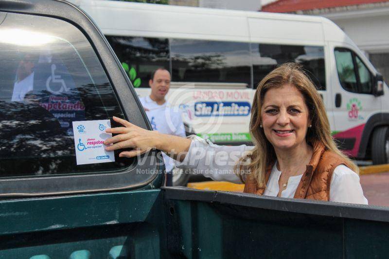 Tampico, Tam.- Como parte del Programa “Sin Límite” del sistema DIF Tamaulipas, y con el objetivo de sensibilizar a la población sobre la importancia de respetar los cajones de estacionamiento para personas con discapacidad, la Presidenta del Sistema DIF Tampico, Aída Feres de Nader, llevó a cabo la pega de calcomanías con la leyenda “Vamos respetando sus espacios”.