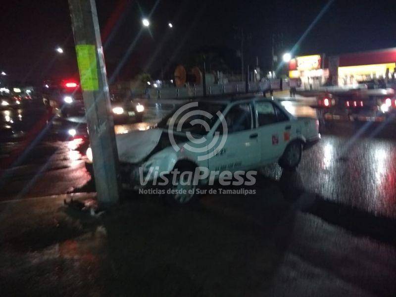 Tampico, Tam.- Fuerte choque se registró la madrugada de este sábado en la zona norte de Tampico, en donde participaron un taxi y un carro de la empresa de televisión por cable IZZI; los dos conductores alegaron haber cruzado con el semáforo en verde.