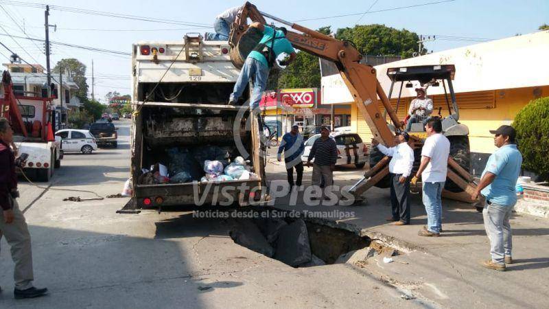Madero, Tam. Un camión recolector de basura cayó a un nuevo socavón que se formó debido al deslave de la tierra a causa de una enorme fuga de agua de la red de la Comisión Municipal de Agua Potable y Alcantarillado.