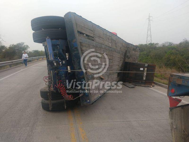 Pánuco, Ver.-La volcadura de una plataforma que transportaba rollos metálicos y era remolcada por un tráiler provocó desquiciamiento vial en transitado tramo carretero cerca de un puente.
