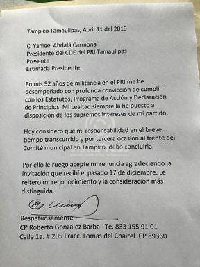 Tampico.- Roberto González Barba, renunció este jueves a su cargo como presidente del Comité Municipal del Partido Revolucionario Institucional en la ciudad pues asegura que los tiempos ya terminaron, que ya hay candidatos e hizo el trabajo que estaba en sus manos hacer pero prefiere dejar el cargo pues en Ciudad Victoria lo consideraban un presidente ‘a la antigüita’.