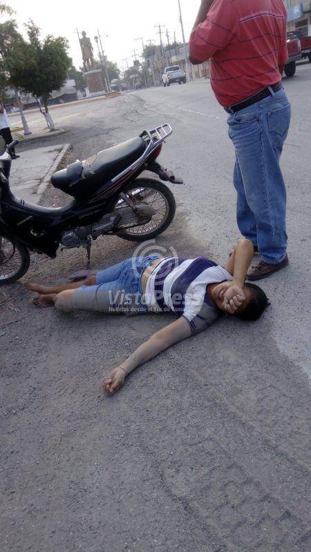 Pánuco, Ver .-Dos lesionados dejó el espectacular choque entre una motocicleta y ciclista; se presume que este último fue el responsable del percance al atravesarse a la primera unidad.