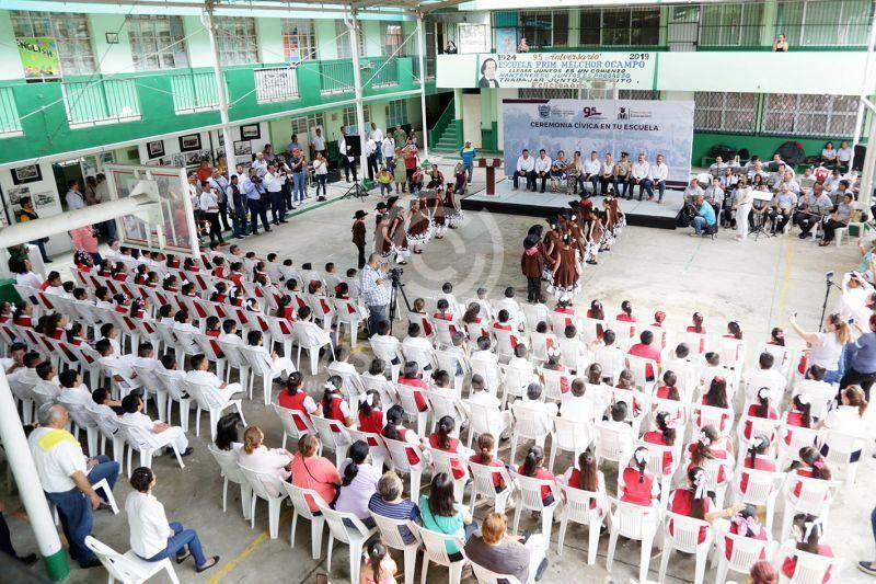Madero, Tam.- En 1924 nació Villa Cecilia como municipio independiente, hoy Ciudad Madero, abriéndose a su vez, las puertas de la emblemática primaria Melchor Ocampo de la colonia Ferrocarrilera; una institución que ha albergado a miles de maderenses por más de 95 años y que fue celebrada este lunes por el Gobierno del alcalde Adrián Oseguera Kernion a través de ceremonia cívica, acompañados del 15/o Batallón de Infantería.