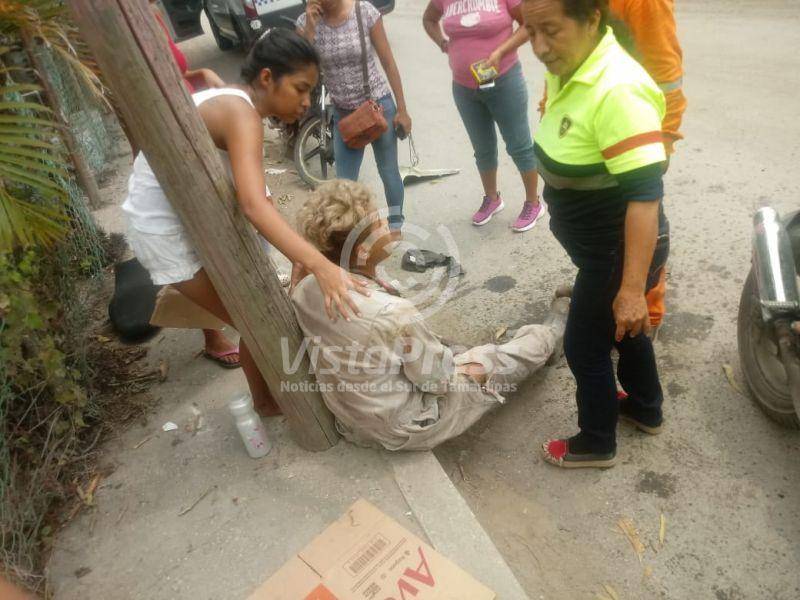 Pueblo Viejo, Ver.-Un joven quedó con probable fractura de fémur y fuerte golpe en la cabeza, luego de que derrapara en su moto y se impactara con la banqueta.