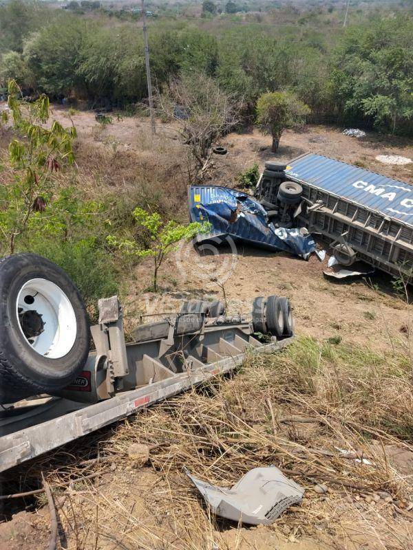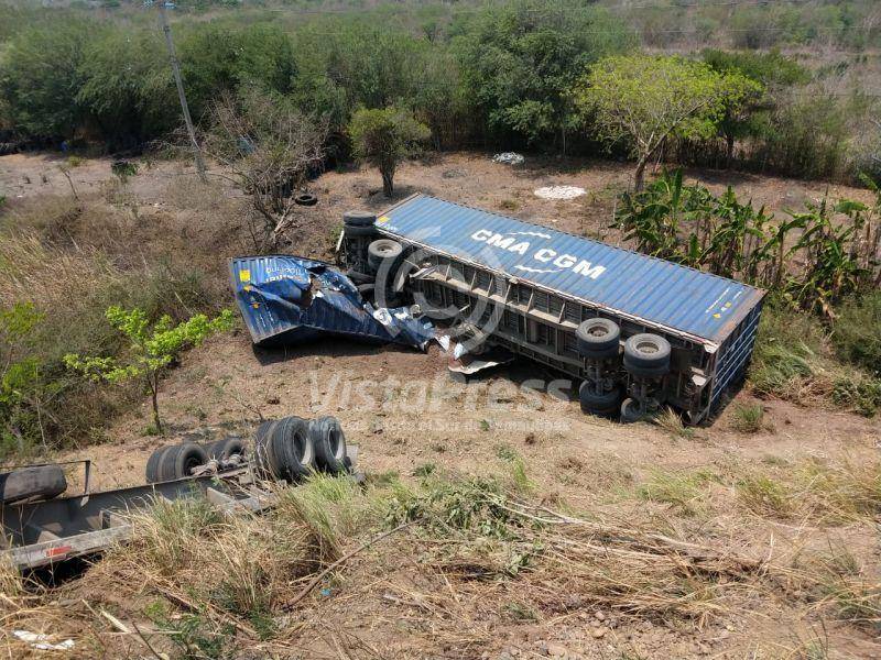 Pánuco, Ver.-El circular a excesiva velocidad, y no dimensionar el peso de la carga, provocó que un tráiler se precipitara a un barranco registrándose elevados daños materiales.
