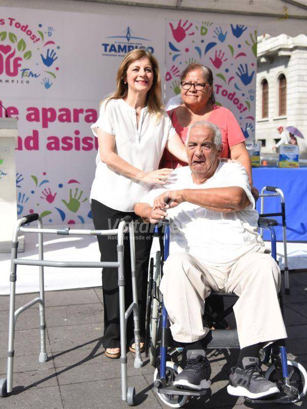 Tampico, Tam.- Con el propósito de elevar la calidad de vida, y para favorecer el desplazamiento de los adultos mayores y personas con discapacidad, la Presidenta del sistema DIF Tampico, Aida Feres de Nader encabezó este viernes la ceremonia de entrega de aparatos de movilidad asistida y apoyos funcionales dentro del programa «DIF Somos Todos», efectuado en la plaza de armas.