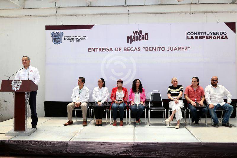 Madero.- En la promoción de una educación incluyente, equitativa y de calidad, el alcalde Adrián Oseguera Kernion encabezó la entrega de becas federales Benito Juárez “Jóvenes Escribiendo el Futuro” con la que además de incentivar el desarrollo académico, se busca disminuir en gran medida el ausentismo escolar en México.