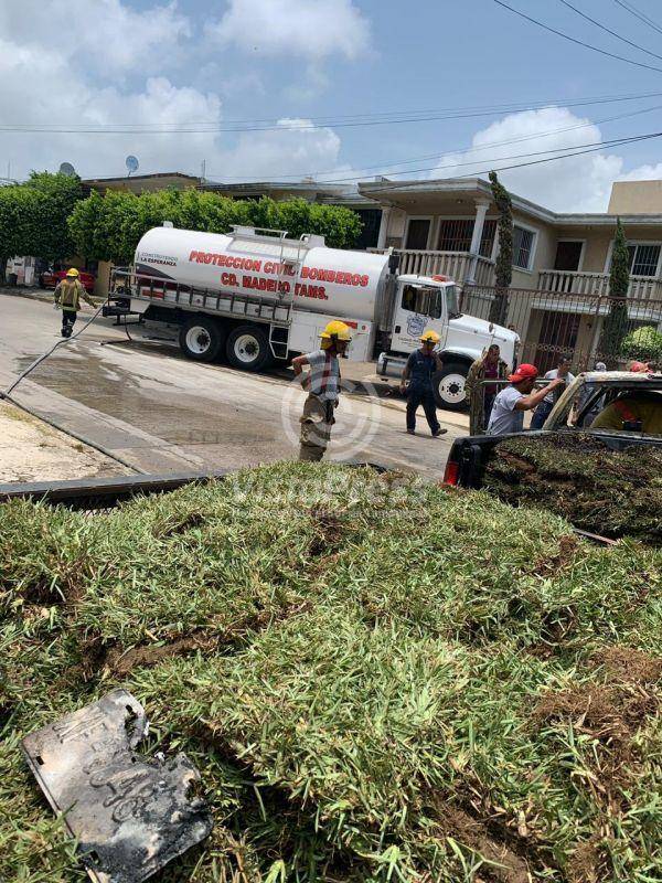 Madero, Tam.- Una camioneta terminó completamente calcinada al incendiarse al mediodía de este viernes cuando se disponía a entrar a un domicilio en donde instalarían pasto natural.