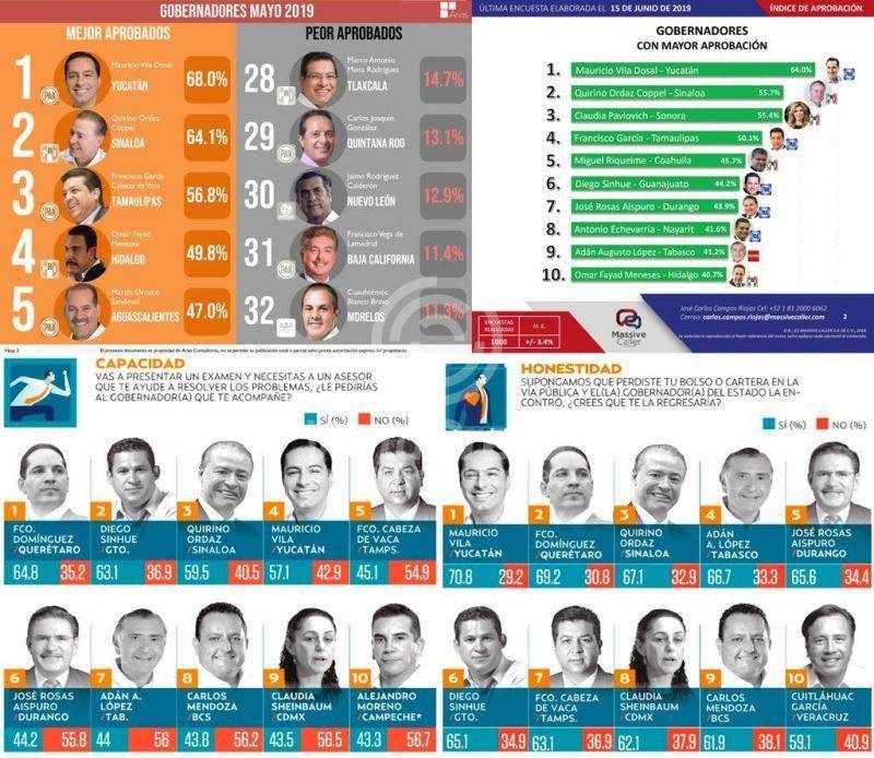 Cd. Victoria, Tamps. A casi 3 años de haber iniciado su mandato, el gobernador de Tamaulipas, Francisco García Cabeza de Vaca se encuentra ubicado entre los gobernadores mejor evaluados del país, de acuerdo a encuestas nacionales realizadas en el mes de mayo y junio de 2019 por las firmas Massive Caller, Arias Consultores y El Heraldo de México.