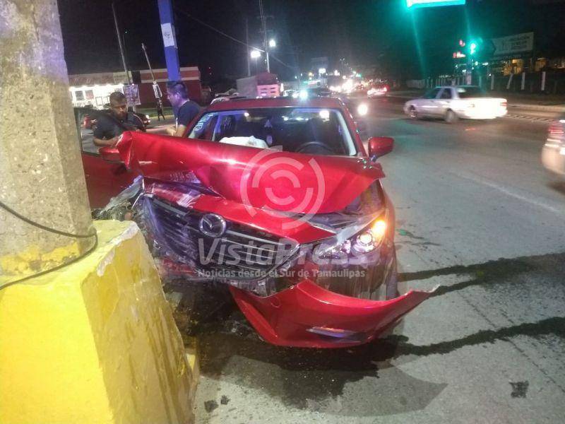 Altamira, Tamps.-Por presuntamente circular bajo los efectos de las bebidas embriagantes, un joven se impactó contra la base de un poste de cemento, destrozando su unidad motriz de reciente modelo.