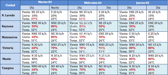Se prevé a partir del martes temperatura máxima de 32°C y mínimas de 22°C, con viento moderado de dirección norte de 20-30 km/h con rachas que podrían superar los 50 km/h principalmente en zonas costeras. Alta probabilidad de lluvia de moderada a muy fuerte durante el periodo de pronóstico. Se mantendrá clima fresco en zonas altas (mínima de 13°C en Miquihuana).