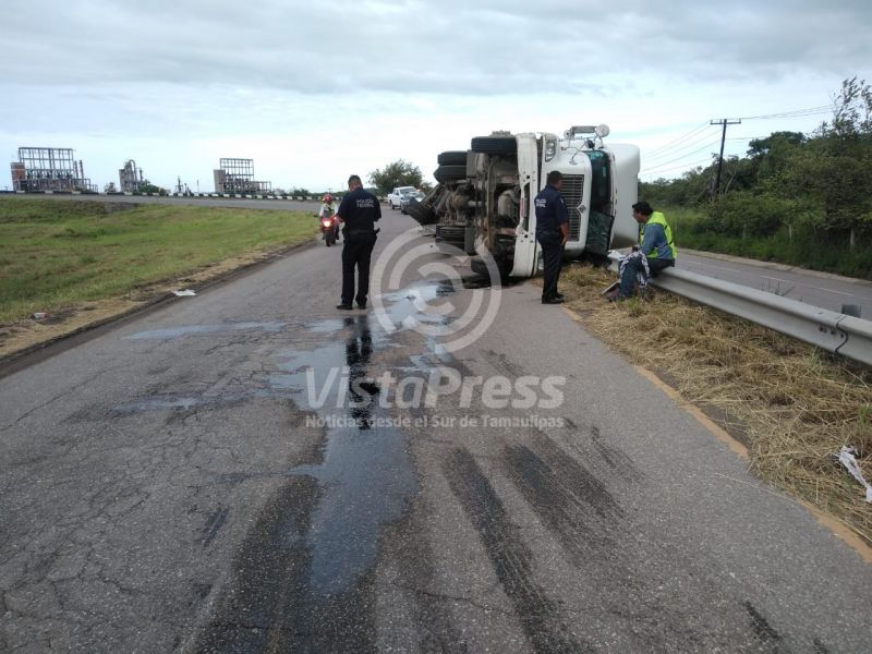 Altamira, Tam. Un tráiler cargado con materia prima plástica volcó la tarde de este jueves en una pronunciada curva de retorno hacia el Puerto de Altamira.