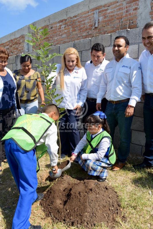 La jefa edilicia encabezó una jornada de reforestación en las áreas verdes de esta primaria, además de poner en marcha el programa “Huertos Escolares’’, supervisar la exhibición de los vehículos y equipo del personal de la Policía Estatal y entregar material deportivo al alumnado.