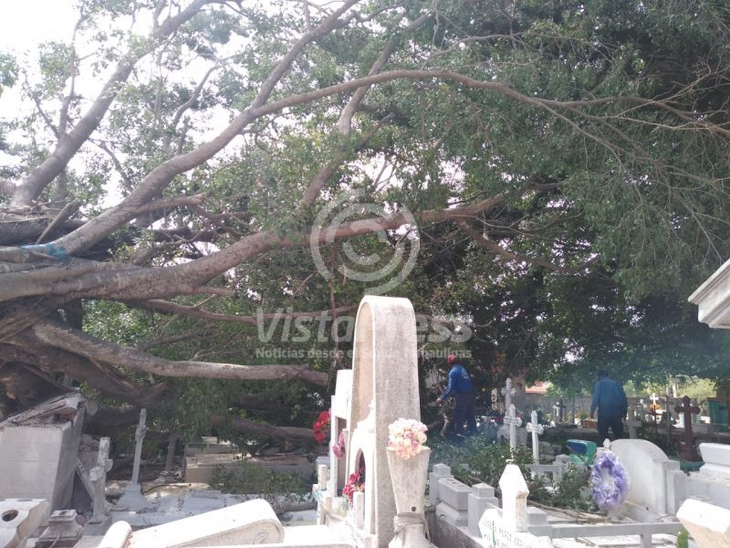 Altamira, Tam.- Un enorme árbol cayó sobre las tumbas del panteón municipal de la zona centro de Altamira, por lo que tuvieron que acudir elementos de Bomberos para retirarlo.