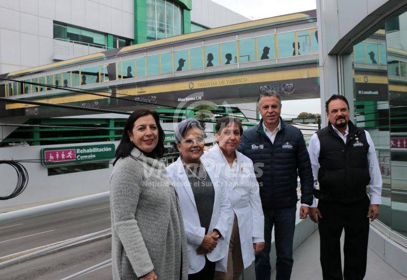 El presidente municipal de Tampico Chucho Nader inauguró este miércoles la escultura urbana del tranvía sobre la avenida Hidalgo, en el puente peatonal que une a los edificios del Hospital Cemain.