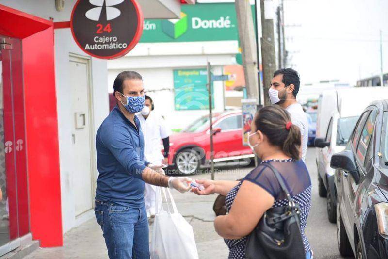 Como parte de las acciones contra el Covid 19, el Diputado Local Mon Marón recorrió Instituciones Bancarias ubicadas en avenidas y calles de la zona norte de Tampico para repartir Gel Antibacterial a los ciudadanos que realizaban fila a la espera de realizar un trámite bancario.