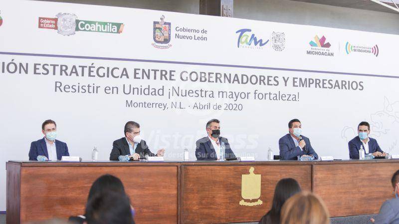 Monterrey, N.L..- Los gobernadores de Tamaulipas, Nuevo León, Coahuila, Durango y Michoacán, sostuvieron este viernes una reunión estratégica con empresarios y representantes de los sectores productivos de cada entidad, en la que acordaron acciones conjuntas para reactivar la economía de los estados y proteger el empleo, ante el impacto negativo de la emergencia sanitaria por COVID-19.