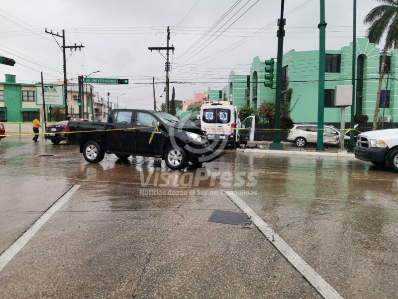 Tampico, Tam.- Fuerte choque se registró la mañana de este lunes en donde participó una ambulancia del DIF de Pueblo Viejo y dos camionetas de reciente modelo en donde tres personas resultaron lesionadas.
