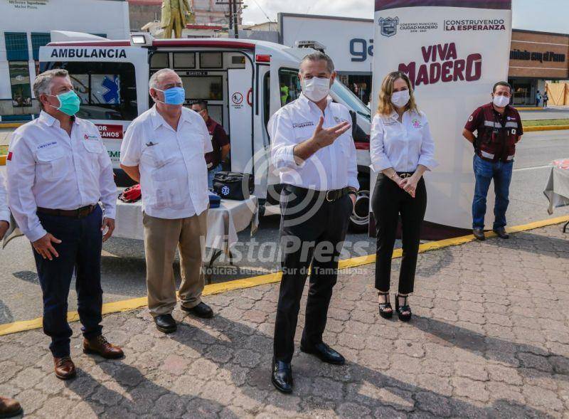 Fue en la explanada de la Presidencia Municipal donde el alcalde en compañía de su esposa, la Sra. Ana Cristina Organista de Oseguera, Presidenta del Sistema DIF Madero, encabezó la recepción de un camión recolector de basura, una ambulancia e importante equipamiento médico.