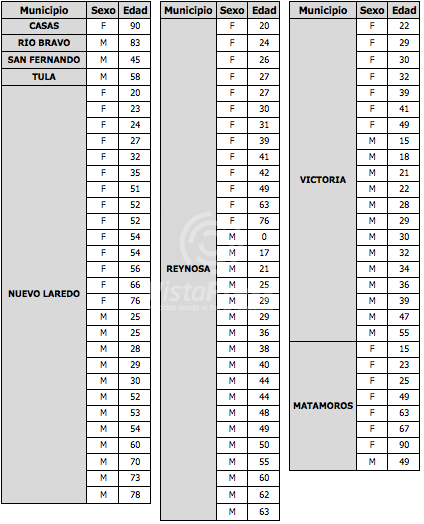 En tanto, los fallecimientos corresponden a un hombre de 77 años de El Mante, un hombre de 33 años de Reynosa, una mujer de 69 años de Tampico, así como una mujer y hombre, ambos de 71 años de Matamoros, todos ellos registrados el 23 de junio; una mujer de 62 años de Nuevo Laredo y 2 mujeres de 52 y 66 años de Matamoros del 24 de junio.