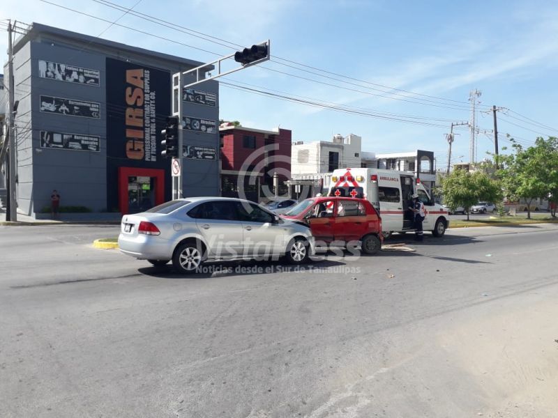 Madero, Tam. Aparatoso choque se registró la tarde de este martes entre un carro particular y un taxi en el que el conductor responsable se da a la fuga corriendo del lugar.