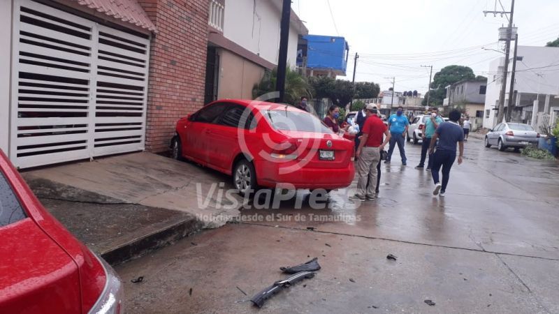 Al momento del impacto entre las dos unidades, el carro de la marca Vento salió proyectado hacia una vivienda, dañando parte de la fachada, mientras que la otra unidad tumba un poste de madera de Teléfonos de México, así como el cableado.