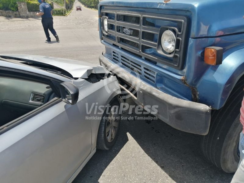Altamira, Tam.- Un vehículo compacto resultó con fuertes daños materiales al ser impactado de frente por un camión materialista, cuyo conductor aparentemente se pasó el alto indicado por el semáforo.