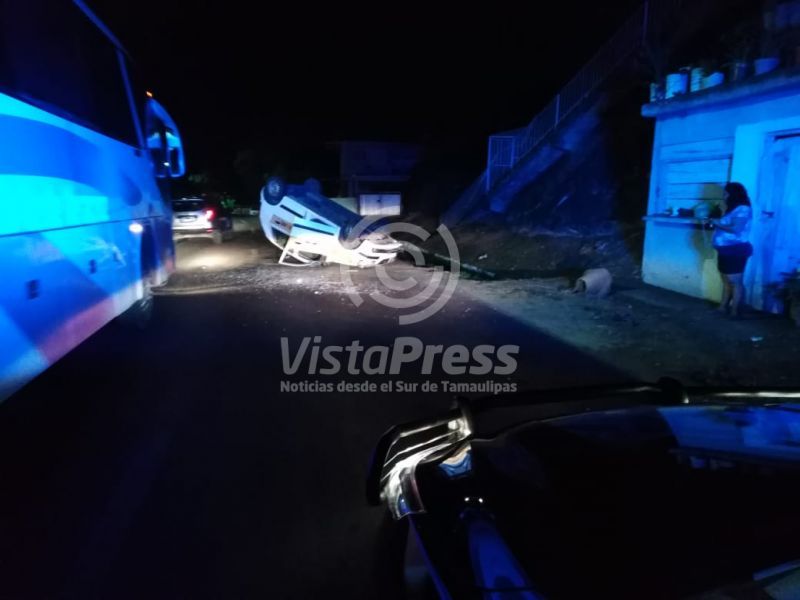 Tampico, Tam.- Un vehículo habilitado como taxi volcó en la salida de Tampico y el conductor prefirió darse a la fuga; aparentemente tomó la curva pronunciada a exceso de velocidad y perdió el control del volante.