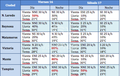 Se prevé a partir del viernes temperatura máxima de 33°C y mínimas de 19°C, con viento moderado de dirección norte de 20 km/h con rachas que podrían superar los 60 km/h principalmente en zonas costeras. Alta probabilidad de lluvia de moderada a fuerte puntual, durante el ingreso del fenómeno. Se mantendrá clima frio en zonas altas (mínima de 9°C durante la noche en Miquihuana).
