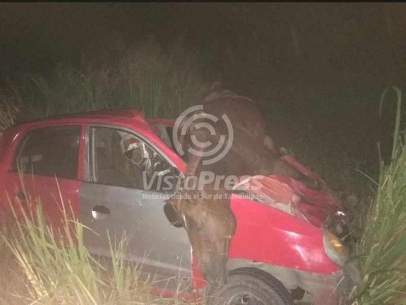 El accidente se registró alrededor de las 05:30 horas de este martes a un kilómetro de llegar al ejido Morón de esta ciudad en donde quedó un carro de la marca Dodge Atos en color rojo completamente destruido tras el impacto con el semoviente, mismo que murió tras el fuerte golpe.
