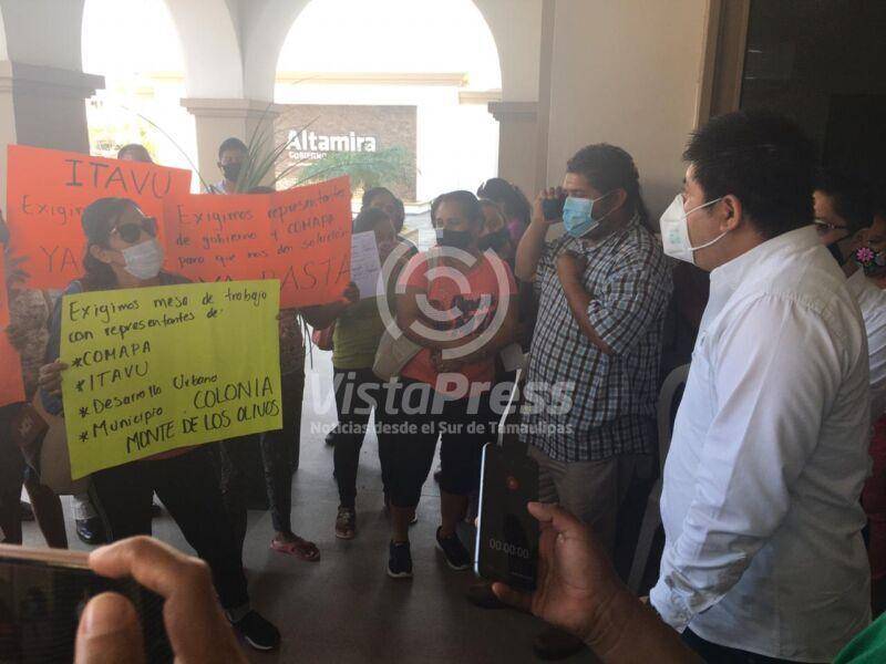 Altamira, Tam.- Habitantes de la colonia Monte de los Olivos protestaron este jueves en las instalaciones de la Presidencia Municipal de Altamira exigiendo la intervención de las autoridades, toda vez que de duelen que no tienen servicios básicos debido a que el ITAVU no les ha liberado la carta de asignación.
