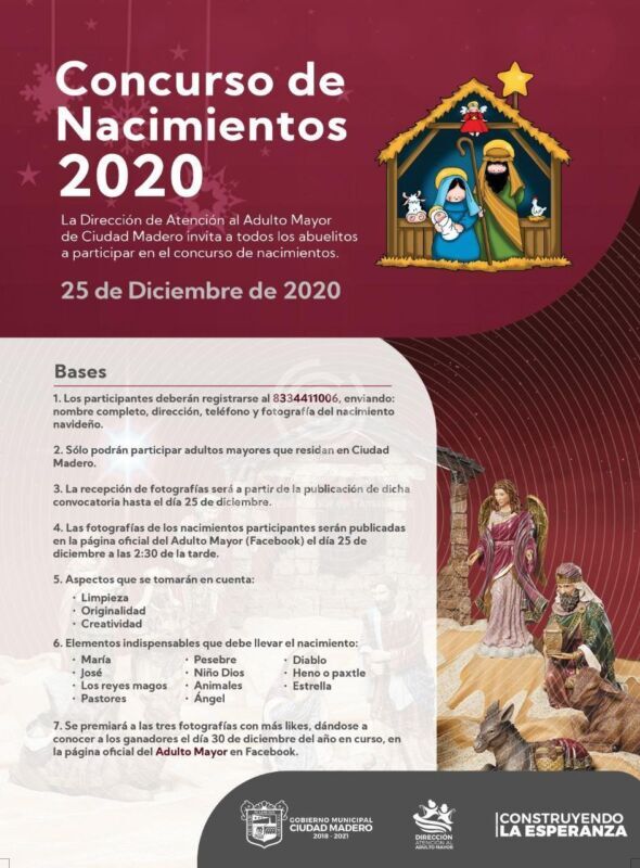 Para fomentar las tradiciones mexicanas, el Gobierno de Ciudad Madero invita a los adultos mayores que residen en la urbe petrolera, a participar en el Concurso de Nacimientos 2020, que se llevará a cabo el próximo 25 de diciembre y cuya convocatoria cierra ese mismo día.