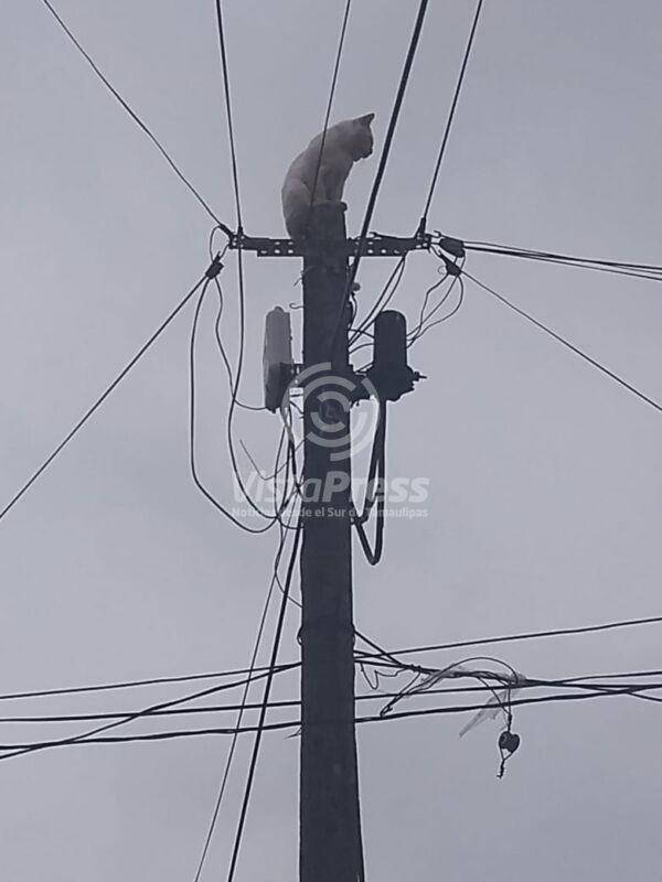 Madero, Tam.- Un felino fue rescatado tras quedar atrapado en la copa de un poste de Teléfonos de México; vecinos pidieron el apoyo de los Bomberos.