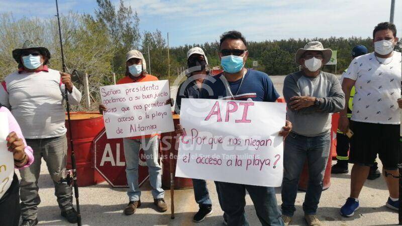 Altamira, Tam.- Un grupo de pescadores protestó en el acceso de la playa de Miramar, justo en la caseta de vigilancia perteneciente a la Administración Portuaria Integral de Altamira, exigiendo su apertura, toda vez que refieren es un derecho que tienen los mexicanos.