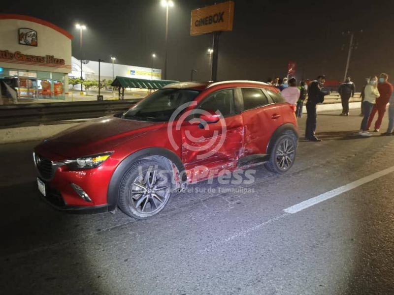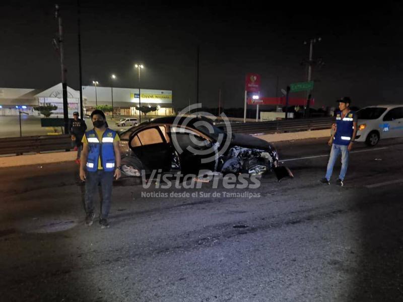 Ambas unidades eran conducida de sur a norte, por la carretera Tampico-Mante y al descender del puente elevado, el conductor del vehículo compacto pierde el control del volante y se impacta en un costado de la camioneta.
