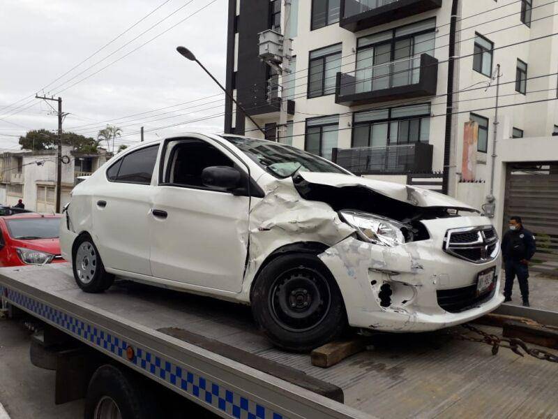 Se trata de un vehículo de la marca Dodge Atittude en color blanco que era conducido por la Cerro Azul y al llegar al cruce, impacta en la parte media a una patrulla policiaca con número económico 1406, de la marca Dodge Avanger.