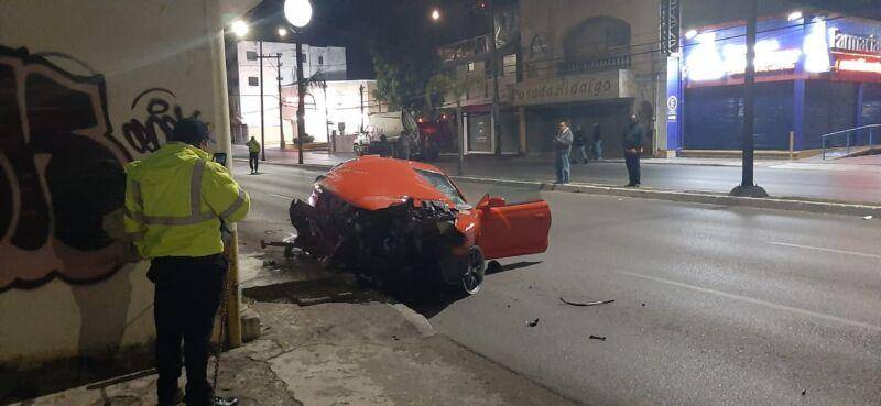 Se trata de un carro de la marca Ford Mustang en color rojo, mismo que se impactó en la barda del negocio denominado Inguanzo SA de CV., al que le ocasionó un enorme boquete tras el impacto, quedando el bólido vehículo a unos 70 metros de distancia sobre la referida vialidad.