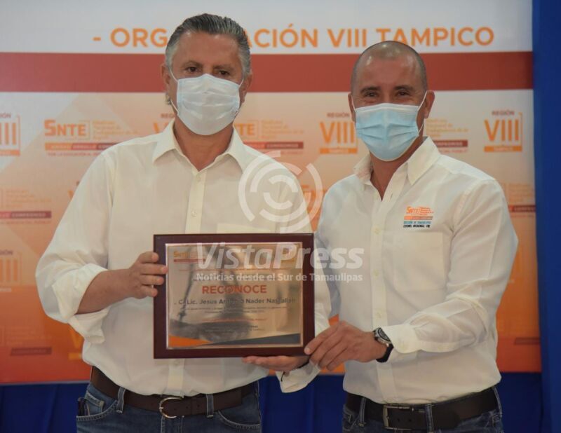 El Presidente municipal Chucho Nader recibió la tarde de este jueves, un reconocimiento por parte de la coordinación de Secretarios Generales del SNTE por el apoyo que la autoridad municipal ha destinado a la base magisterial de Tampico durante su administración.