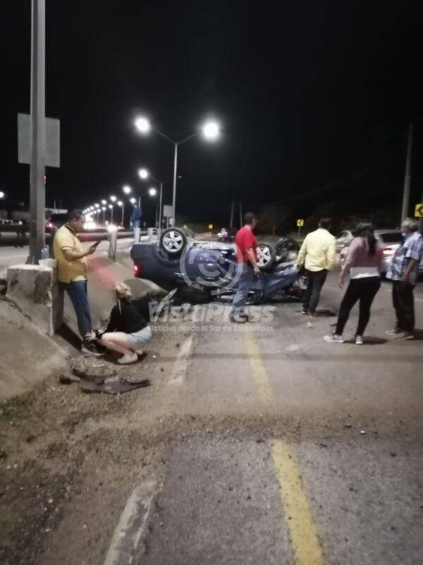 Madero, Tam. Un hombre resultó lesionado al chocar con el barandal de protección y volcar en su vehículo compacto la noche de este sábado.