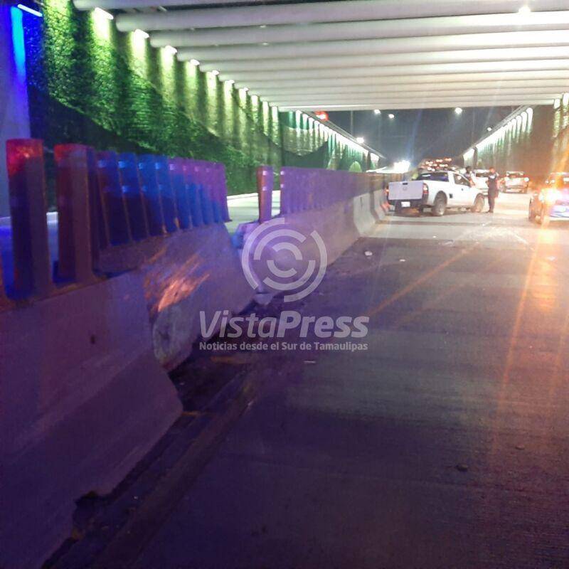 La unidad era conducida de sur a norte a exceso de velocidad por lo que al tomar la curva de ese paso a desnivel, el operador perdió el control del volante para luego impactarse contra el muro de contención que sirve como camellón central, moviendo varios centímetros de su lugar uno de los bloques de concreto.