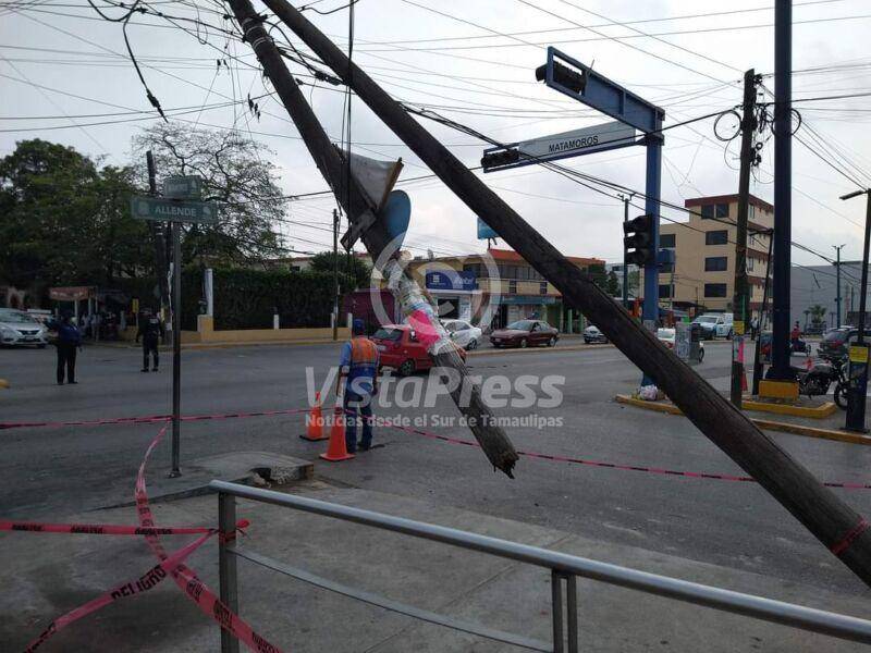 Este martes se realizó un reporte a las autoridades en el que se daba a conocer que un poste había sido tumbado tentativamente en un accidente vehicular y se encontraba colgando sobre unos cables en la zona centro de Altamira.
