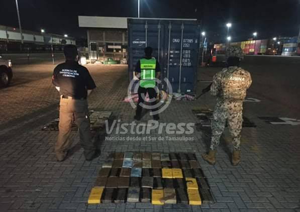 contenedor en el área del sistema de refrigeración, que al ser analizados por personal de la Fiscalía General de la República (FGR), dieron como resultado un peso aproximado de 43.5 (cuarenta y tres punto cinco) kilogramos de clorhidrato de cocaína, quedando a disposición de citada Fiscalía, integrándose la carpeta de investigación correspondiente.