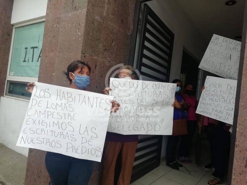 Por lo menos 150 familias de las colonias Lomas Campestre y Lomas de Miralta protestaron esta mañana a las afueras de ITAVU en Altamira, ante el retraso del proceso para la legalización de sus terrenos.