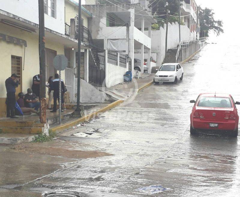 Debido a la fuerte lluvia, con apoyo de peatones, el lesionado fue movido a un aleron de una vivienda para protegerse del agua.