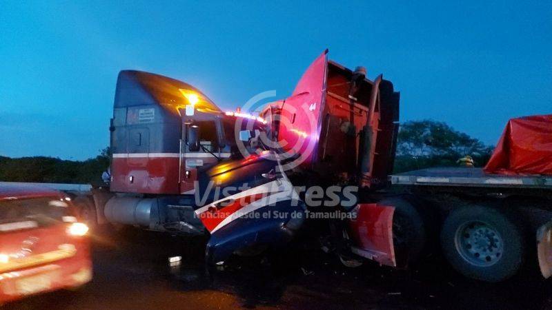 Tampico, Tam. fuerte choque carretero se registró la tarde- noche de este sábado en el Libramiento Poniente en donde dos trailer se impactan de frente teniendo como resultado fuertes daños materiales.