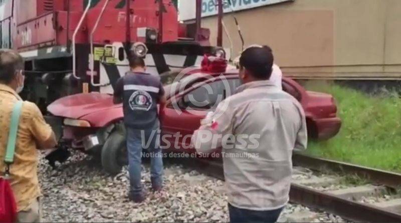 Altamira, Tam. Fuerte susto se llevó una conductora que fuera impactada a bordo de su vehículo compacto por el tren en plena zona centro de la ciudad, resultando por fortuna sin lesiones de gravedad.
