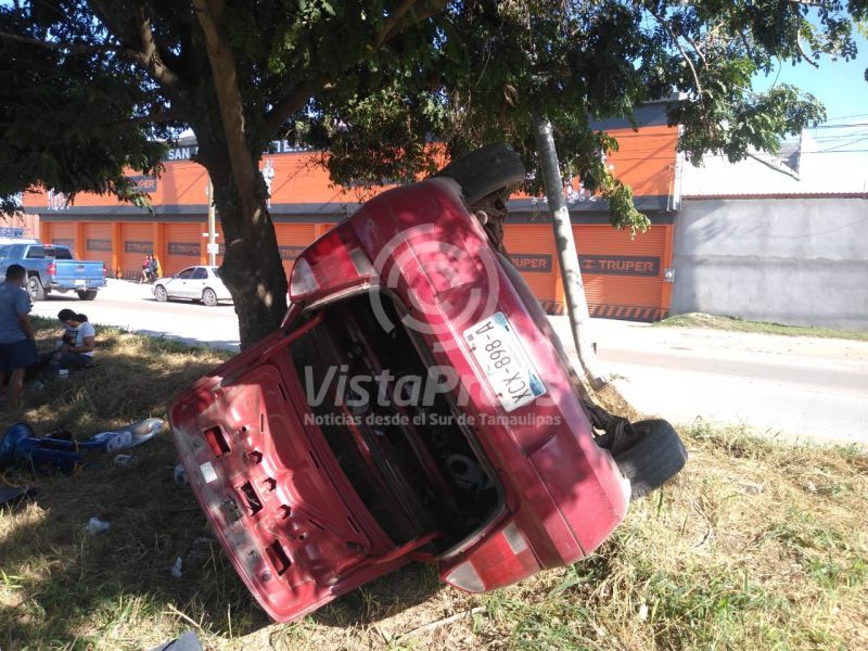 Altamira, TAM. Una mujer resultó con lesiones ligeras al volcar en su vehículo compacto en el Bulevar Primex, quedando la unidad recargada en un árbol en el camellón central.