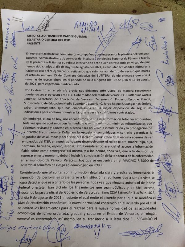 Este escrito es dirigido al gobernador del estado Cuitlahuac Jiménez, e igual que a las autoridades educativas encabezados por el secretario de educación de Veracruz, Zenyancen Roberto Escobar García, indicando que están abiertos a atender las indicaciones oficiales para incorporarse a las labores para las que han sido contratados.