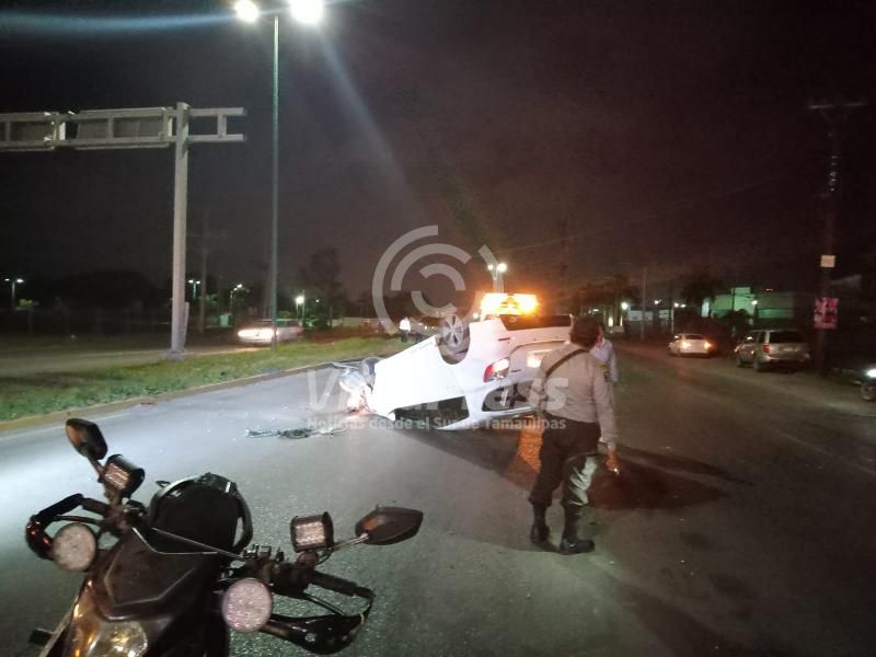 Altamira, TAM. Un vehículo compacto terminó volcado frente al Fraccionamiento Náutico, luego de que impactaran a una camioneta de transporte de personal.