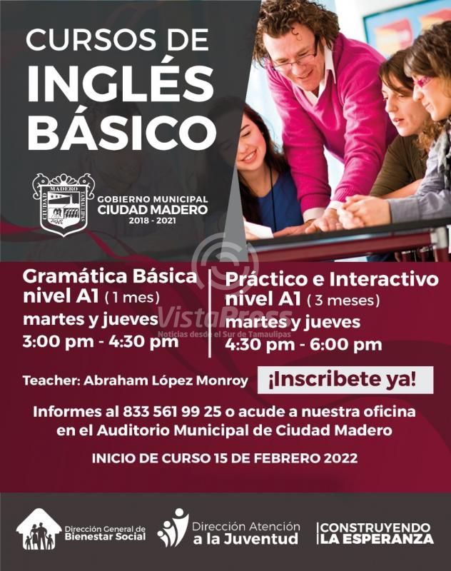 Madero, Tam.- El Gobierno de Ciudad Madero a través de la dirección de Atención a la Juventud invita a la población en general a inscribirse a los cursos de inglés Básico y Práctico Interactivo, mismos que se impartirán de manera virtual a bajo costo.